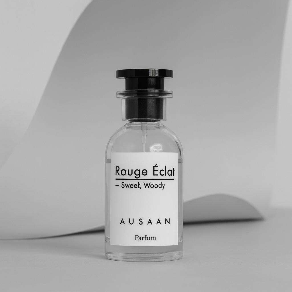 Rouge Éclat by AUSAAN is a luminous and unforgettable parfum that envelops the skin in a veil of airy sweetness and woody sophistication. Opening with golden saffron and delicate jasmine, it melts into a glowing amber heart before finishing with crisp cedar and balsamic depth.